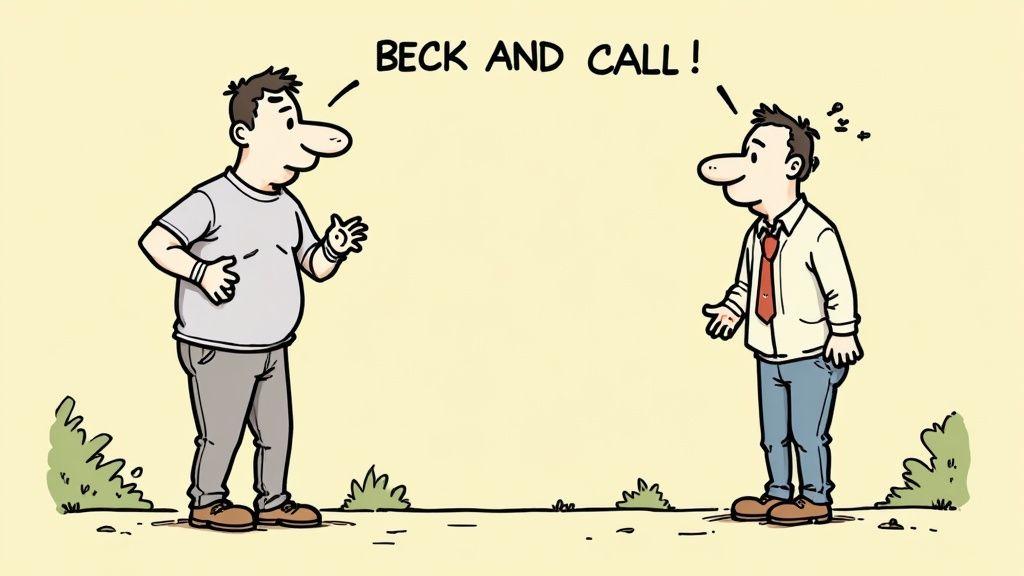 Clear examples make abstract concepts easier to grasp. Picture a medieval servant attending to their lord's every need, day and night - that's what being at someone's "beck and call" means. Think of it like a personal assistant who anticipates and responds to every request. These vivid images help distinguish the correct phrase from the incorrect "beckon call."